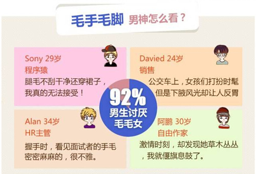 夏季闪亮登场,漂亮时尚女孩的吊带衫、超短裙也遍布大街小巷,大小美眉穿着泳装尽情欢拥大海,写字楼的职业女性肆无忌惮的穿着超短裙、齐膝裙穿梭在电梯中……但腋下、四肢厚重的毛发却出卖了你!你还敢肆无忌惮的大胆“露”吗?毛毛脱光光,那才叫爽!超短裙、露背装,想穿就穿,再也不要毛手毛脚,再也不要做“猩”女郎。