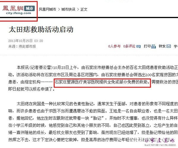 2013年10月23日,石家庄星源医疗美容医院联合市慈善总会共同发起公益救助太田痣患者大型公益活动,为符合条件的太田痣患者提供免费救治。此举动引发省会各大媒体竞相报道和关注。