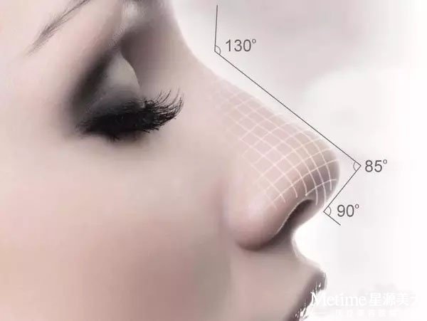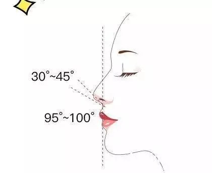 鼻根部与下巴下拉长成一条垂直线,鼻子微微隆起的高度恰与其形成的&佳角度为30°~45°;鼻头与人中之间的倾斜角度,大约为95°~100°!