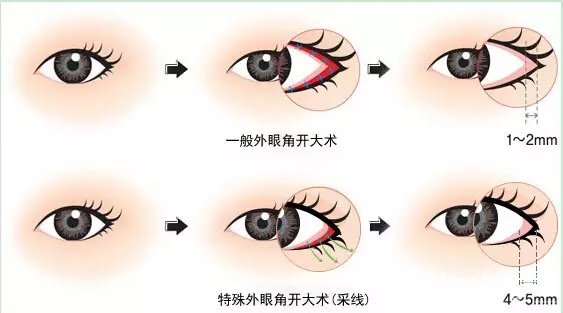开外眼角:通过切开眼角侧粘膜,延长眼睛的水平长度(2-5mm左右),达到眼睛变大的目的。