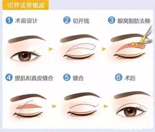 切开法就是在上眼皮的适当位置切开皮肤,去除部分眼轮匝肌或眶隔脂肪,并将眼皮皮肤与睑板或上睑提肌腱缝合在一起。