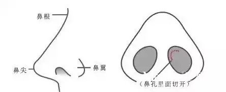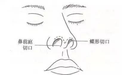 切口位置:鼻孔缘、鼻小柱蝶形切口。