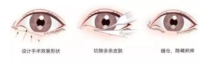 通过隐蔽切口,将内眼角部位的赘皮去掉,从而让眼裂弧度变长。