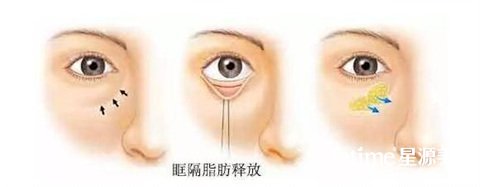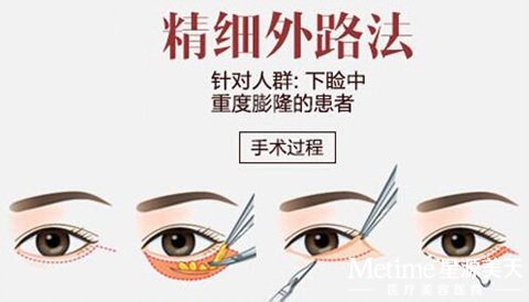 通过手术将眼部膨隆脱出的脂肪祛除、肥厚下垂的眼轮匝肌修薄悬吊、松弛的皮肤切除,使面部年轻化。大致分为:眼轮匝肌肥厚型、眶隔脂肪膨出型、皮肤皱纹松弛型、下睑泪沟凹陷型。