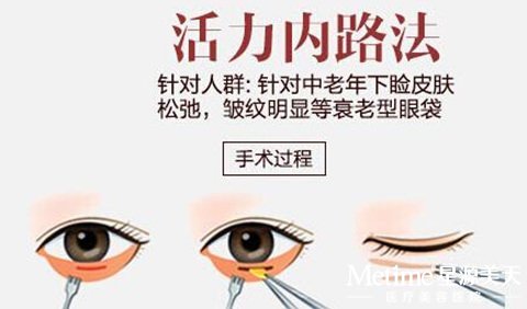 适合皮肤紧致,年纪较轻者,或下睑皮肤稍多或眶隔脂肪突出者。通过在下眼睑内侧面作精细小切口,之后将暴露出来的多余眶隔脂肪祛除,因而皮肤表面无任何切口痕迹。