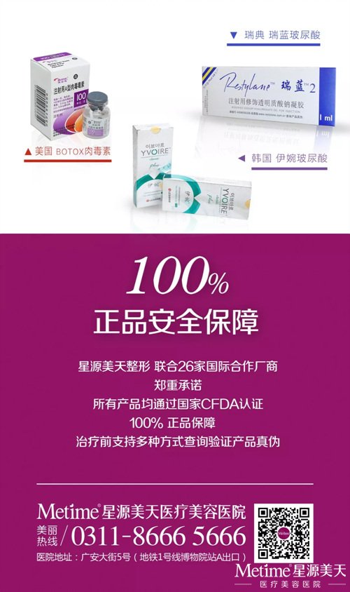 星源美天只使用获得美国FDA、欧盟CE、中国CFDA三重认证的安全材料,原厂授权及合作基地,均系原厂授权合作,正规渠道购进的注射剂,拒绝中间渠道,确保正品;保障所使用的注射材料和假体材料不存在任何问题。