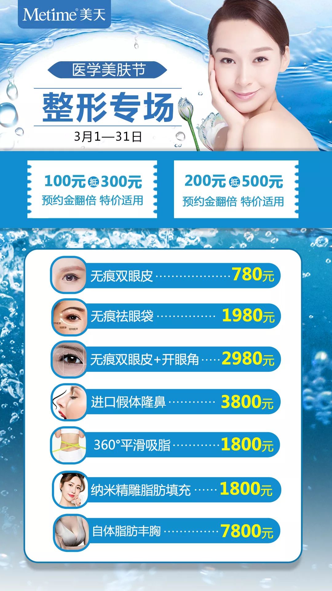 全院消费满:1000/2000/3000/5000赠100/300/500/1000医学美肤券1张;